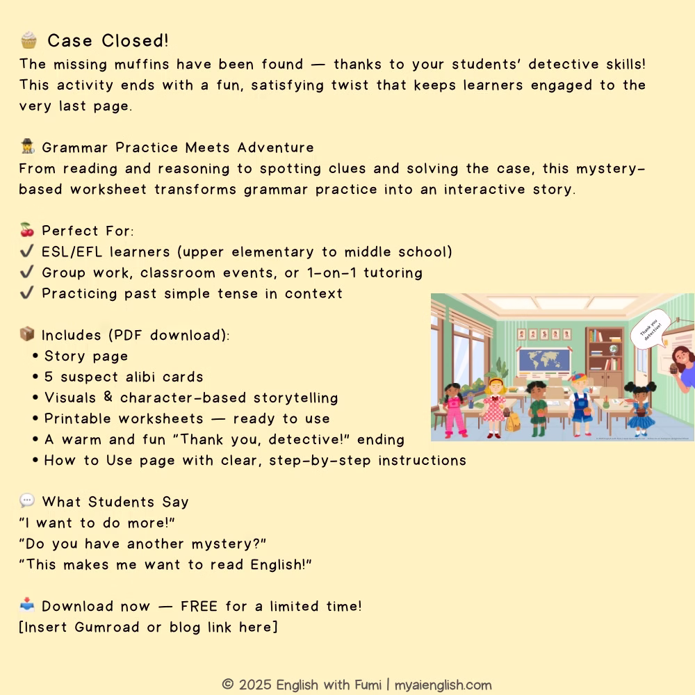 ãDetective Grammar: The Missing Muffinsãã¯ãçŸåš ç¡æPDFææ ãšããŠé åžäžã§ãã ãã²ããŠã³ããŒãããŠãææ¥ãã¬ãã¹ã³ã§æŽ»çšããŠã¿ãŠãã ãããçãäžããäºãŸã¡ãããªãïŒã§ããæ¢åµãã®ã¯ç¹°ãè¿ããŠã§ããªãã®ã§ïŒç¬ïŒã³ãã³ãäœæãããã®ãé æ¬¡ã¢ããããŠãããããšæããŸãã